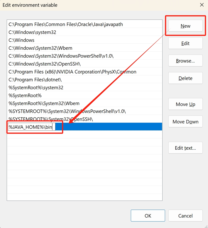 15. You will see this window. Click new, then enter %JAVA_HOME%Then click OK. You might need to wait for a minute before trying the following steps.