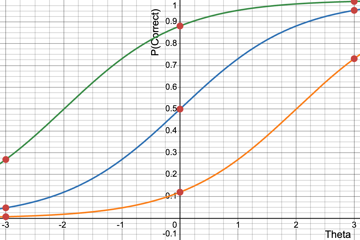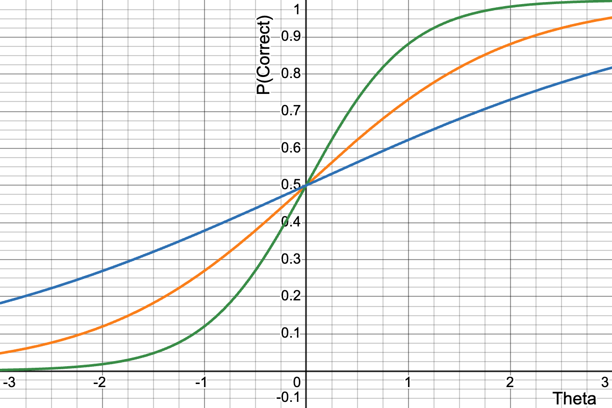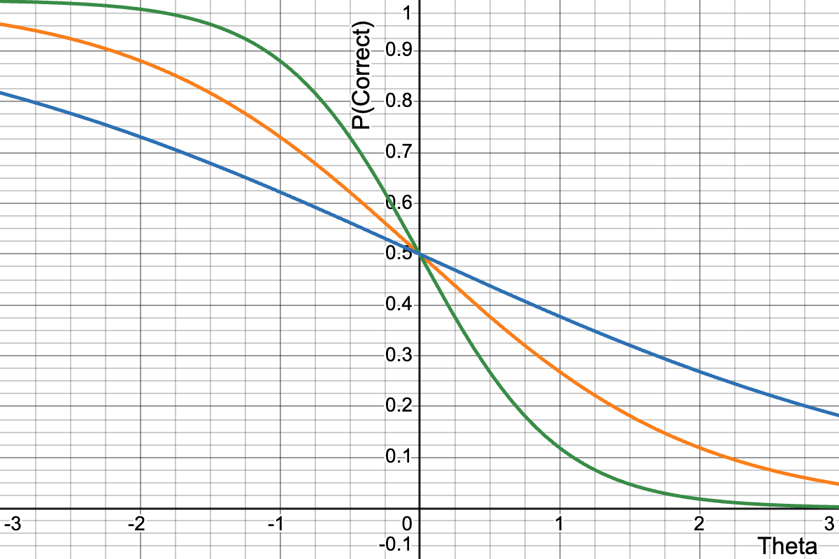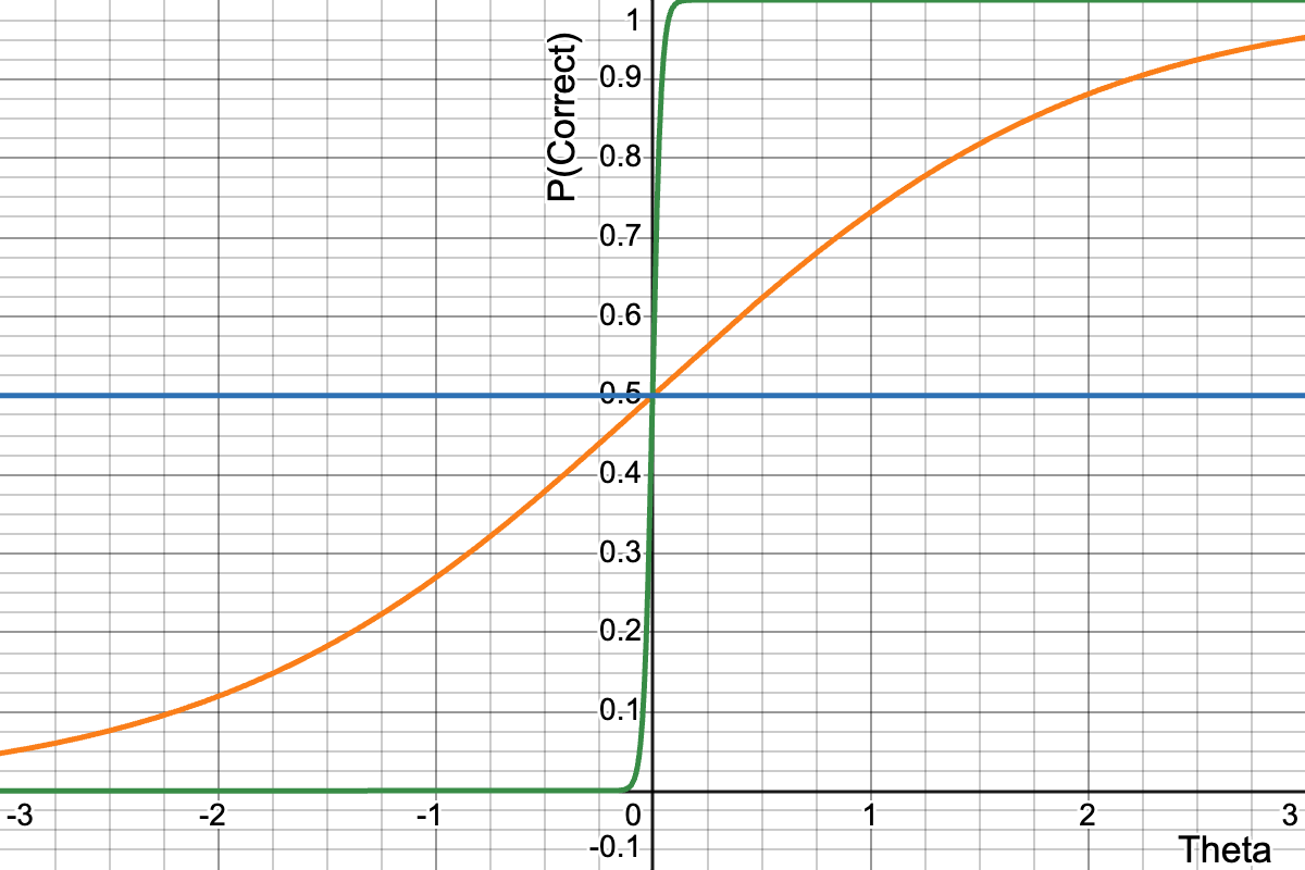 The green line has a equals 2, and that gives it higher discriminability. It’s kind of making a faster transition as students get better between being really hard and really easy